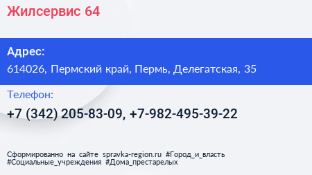 Жилсервис 64 по адресу 614026, Пермский край, Пермь, Делегатская, 35 в дальнейшем Организация, размещена в следующих категориях:
