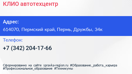 КЛИО, автотехцентр по адресу 614070, Пермский край, Пермь, Дружбы, 34к в дальнейшем Организация, размещена в следующих категориях: