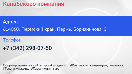 Канабеково, компания по адресу 614068, Пермский край, Пермь, Борчанинова, 3 в дальнейшем Организация, размещена в следующих категориях:
