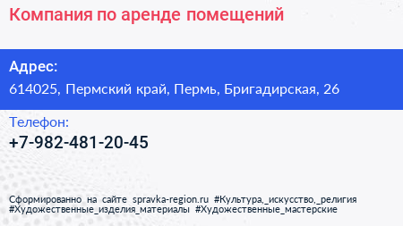 Компания по аренде помещений по адресу 614025, Пермский край, Пермь, Бригадирская, 26 в дальнейшем Организация, размещена в следующих категориях: