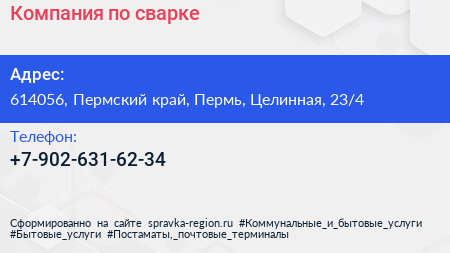 Компания по сварке по адресу 614056, Пермский край, Пермь, Целинная, 23/4 в дальнейшем Организация, размещена в следующих категориях: