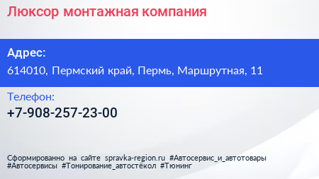 Люксор, монтажная компания по адресу 614010, Пермский край, Пермь, Маршрутная, 11 в дальнейшем Организация, размещена в следующих категориях: