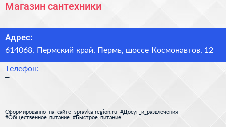 Магазин сантехники по адресу 614068, Пермский край, Пермь, шоссе Космонавтов, 12 в дальнейшем Организация, размещена в следующих категориях:
