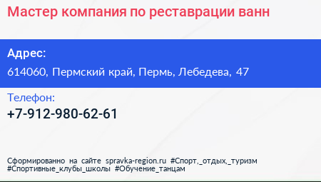 Мастер, компания по реставрации ванн по адресу 614060, Пермский край, Пермь, Лебедева, 47 в дальнейшем Организация, размещена в следующих категориях: