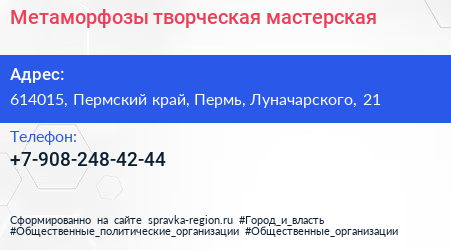 Метаморфозы, творческая мастерская по адресу 614015, Пермский край, Пермь, Луначарского, 21 в дальнейшем Организация, размещена в следующих категориях: