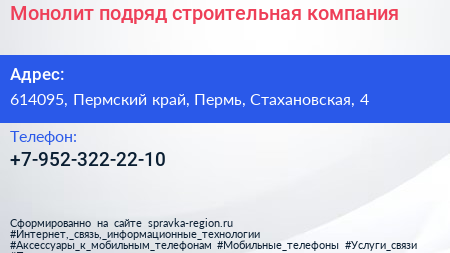Монолит подряд, строительная компания по адресу 614095, Пермский край, Пермь, Стахановская, 4 в дальнейшем Организация, размещена в следующих категориях: