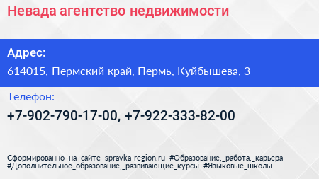 Невада, агентство недвижимости по адресу 614015, Пермский край, Пермь, Куйбышева, 3 в дальнейшем Организация, размещена в следующих категориях:
