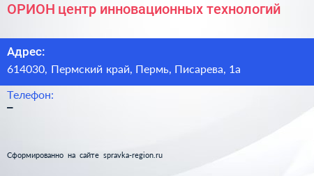 ОРИОН, центр инновационных технологий по адресу 614030, Пермский край, Пермь, Писарева, 1а в дальнейшем Организация, размещена в следующих категориях: