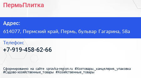 ПермьПлитка по адресу 614077, Пермский край, Пермь, бульвар Гагарина, 58а в дальнейшем Организация, размещена в следующих категориях: