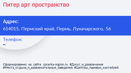 Питер, арт-пространство по адресу 614015, Пермский край, Пермь, Луначарского, 56 в дальнейшем Организация, размещена в следующих категориях: