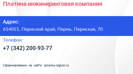 Платина, инжиниринговая компания по адресу 614015, Пермский край, Пермь, Пермская, 70 в дальнейшем Организация, размещена в следующих категориях: