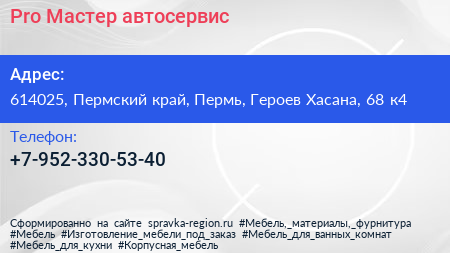 Pro Мастер, автосервис по адресу 614025, Пермский край, Пермь, Героев Хасана, 68 к4 в дальнейшем Организация, размещена в следующих категориях: