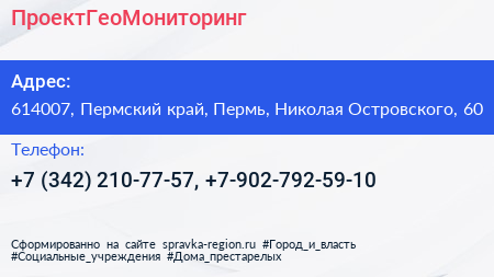 ПроектГеоМониторинг по адресу 614007, Пермский край, Пермь, Николая Островского, 60 в дальнейшем Организация, размещена в следующих категориях: