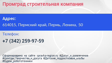 Промград, строительная компания по адресу 614015, Пермский край, Пермь, Ленина, 50 в дальнейшем Организация, размещена в следующих категориях: