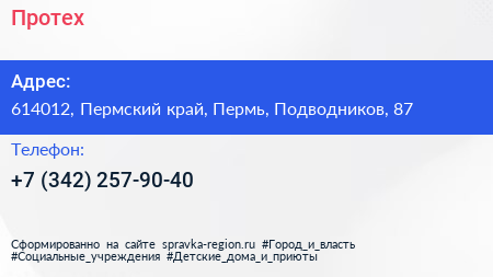 Протех по адресу 614012, Пермский край, Пермь, Подводников, 87 в дальнейшем Организация, размещена в следующих категориях: