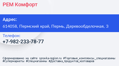 РЕМ Комфорт по адресу 614058, Пермский край, Пермь, Деревообделочная, 3 в дальнейшем Организация, размещена в следующих категориях: