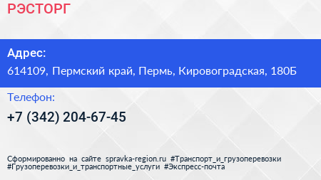 РЭСТОРГ по адресу 614109, Пермский край, Пермь, Кировоградская, 180Б в дальнейшем Организация, размещена в следующих категориях: