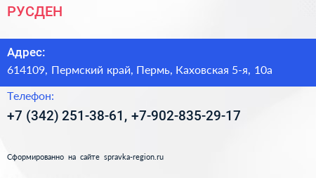 РУСДЕН по адресу 614109, Пермский край, Пермь, Каховская 5-я, 10а в дальнейшем Организация, размещена в следующих категориях: