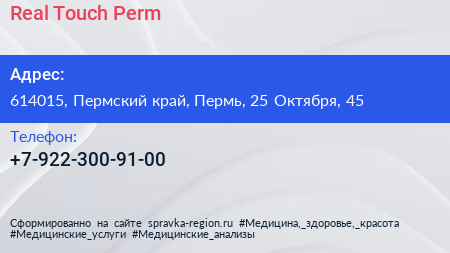 Real Touch Perm по адресу 614015, Пермский край, Пермь, 25 Октября, 45 в дальнейшем Организация, размещена в следующих категориях: