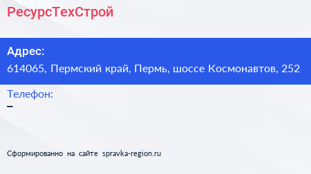 РесурсТехСтрой по адресу 614065, Пермский край, Пермь, шоссе Космонавтов, 252 в дальнейшем Организация, размещена в следующих категориях: