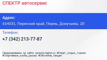 СПЕКТР, автосервис по адресу 614031, Пермский край, Пермь, Докучаева, 20 в дальнейшем Организация, размещена в следующих категориях: