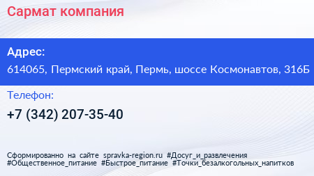 Сармат, компания по адресу 614065, Пермский край, Пермь, шоссе Космонавтов, 316Б в дальнейшем Организация, размещена в следующих категориях: