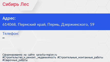 Сибирь-Лес по адресу 614068, Пермский край, Пермь, Дзержинского, 59 в дальнейшем Организация, размещена в следующих категориях: