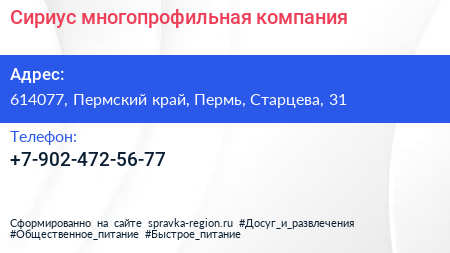Сириус, многопрофильная компания по адресу 614077, Пермский край, Пермь, Старцева, 31 в дальнейшем Организация, размещена в следующих категориях: