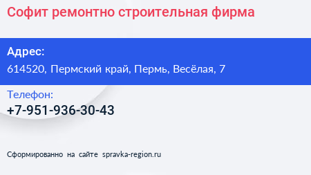 Софит, ремонтно-строительная фирма по адресу 614520, Пермский край, Пермь, Весёлая, 7 в дальнейшем Организация, размещена в следующих категориях: