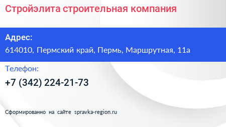 Стройэлита, строительная компания по адресу 614010, Пермский край, Пермь, Маршрутная, 11а в дальнейшем Организация, размещена в следующих категориях: