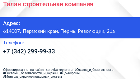 Талан, строительная компания по адресу 614007, Пермский край, Пермь, Революции, 21а в дальнейшем Организация, размещена в следующих категориях: