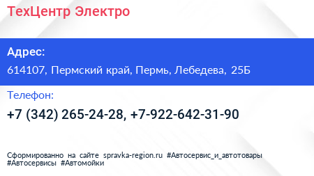 ТехЦентр Электро по адресу 614107, Пермский край, Пермь, Лебедева, 25Б в дальнейшем Организация, размещена в следующих категориях:
