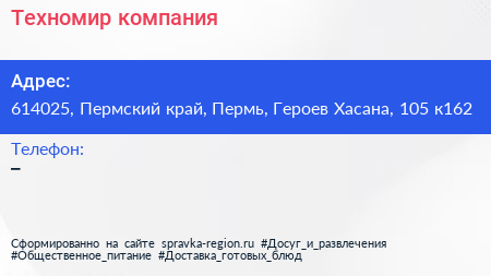 Техномир, компания по адресу 614025, Пермский край, Пермь, Героев Хасана, 105 к162 в дальнейшем Организация, размещена в следующих категориях: