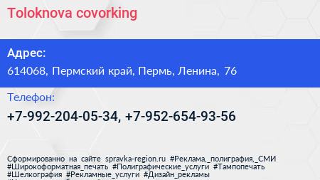 Toloknova covorking по адресу 614068, Пермский край, Пермь, Ленина, 76 в дальнейшем Организация, размещена в следующих категориях: