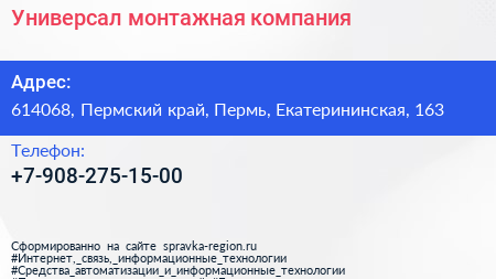 Универсал, монтажная компания по адресу 614068, Пермский край, Пермь, Екатерининская, 163 в дальнейшем Организация, размещена в следующих категориях: