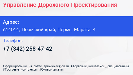 Управление Дорожного Проектирования по адресу 614014, Пермский край, Пермь, Марата, 4 в дальнейшем Организация, размещена в следующих категориях: