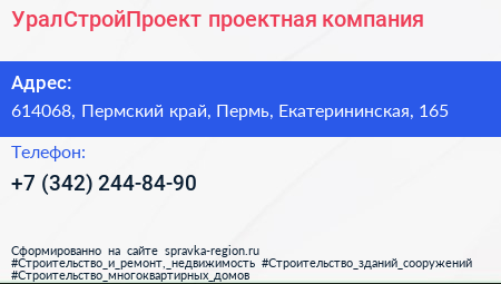 УралСтройПроект, проектная компания по адресу 614068, Пермский край, Пермь, Екатерининская, 165 в дальнейшем Организация, размещена в следующих категориях: