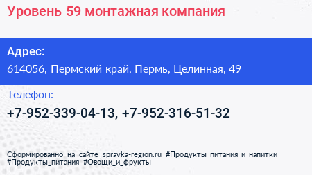 Уровень 59, монтажная компания по адресу 614056, Пермский край, Пермь, Целинная, 49 в дальнейшем Организация, размещена в следующих категориях: