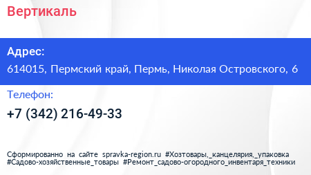 Вертикаль по адресу 614015, Пермский край, Пермь, Николая Островского, 6 в дальнейшем Организация, размещена в следующих категориях: