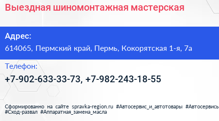 Выездная шиномонтажная мастерская по адресу 614065, Пермский край, Пермь, Кокорятская 1-я, 7а в дальнейшем Организация, размещена в следующих категориях:
