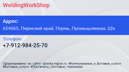 WeldingWorkShop по адресу 614065, Пермский край, Пермь, Промышленная, 22а в дальнейшем Организация, размещена в следующих категориях:
