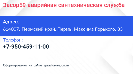 Засор59, аварийная-сантехническая служба по адресу 614007, Пермский край, Пермь, Максима Горького, 83 в дальнейшем Организация, размещена в следующих категориях: