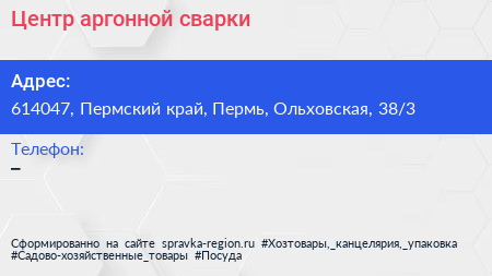 Центр аргонной сварки по адресу 614047, Пермский край, Пермь, Ольховская, 38/3 в дальнейшем Организация, размещена в следующих категориях:
