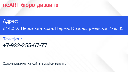 неART, бюро дизайна по адресу 614039, Пермский край, Пермь, Красноармейская 1-я, 35 в дальнейшем Организация, размещена в следующих категориях: