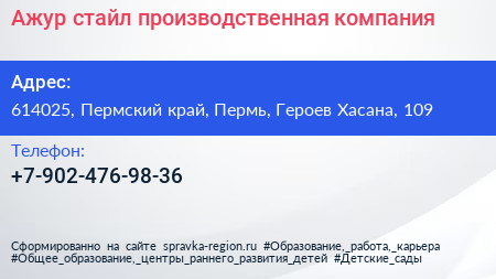 Ажур-стайл, производственная компания по адресу 614025, Пермский край, Пермь, Героев Хасана, 109 в дальнейшем Организация, размещена в следующих категориях: