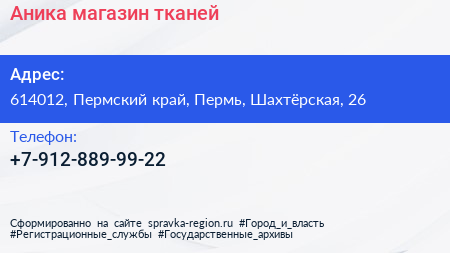 Аника, магазин тканей по адресу 614012, Пермский край, Пермь, Шахтёрская, 26 в дальнейшем Организация, размещена в следующих категориях: