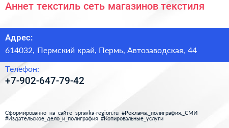 Аннет-текстиль, сеть магазинов текстиля по адресу 614032, Пермский край, Пермь, Автозаводская, 44 в дальнейшем Организация, размещена в следующих категориях: