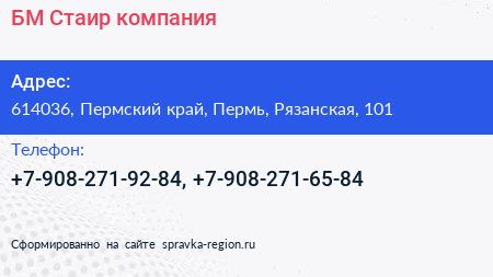 БМ-Стаир, компания по адресу 614036, Пермский край, Пермь, Рязанская, 101 в дальнейшем Организация, размещена в следующих категориях: