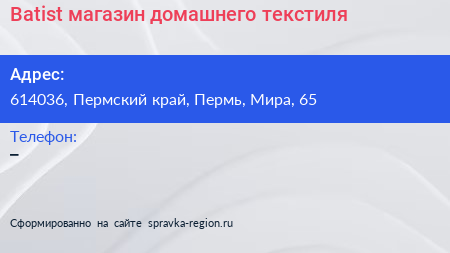 Batist, магазин домашнего текстиля по адресу 614036, Пермский край, Пермь, Мира, 65 в дальнейшем Организация, размещена в следующих категориях: