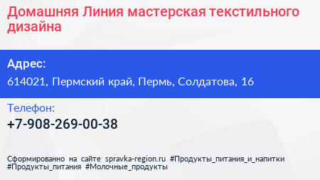 Домашняя Линия, мастерская текстильного дизайна по адресу 614021, Пермский край, Пермь, Солдатова, 16 в дальнейшем Организация, размещена в следующих категориях: